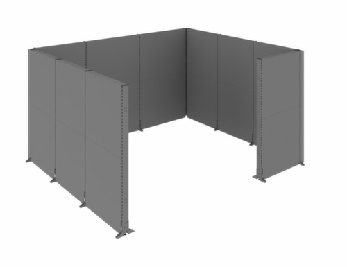 Die wichtigsten Maße des Stellwand-Sets auf einen Blick:Aufstellung: Zur Bodenmontage (Bodenanker müssen bauseitig gestellt werden). Set bestehend aus: 10 Wänden. Davon sind 2 Seiten 3 m lang, 1 Seite ist 3,5 m lang und 1 Eckelement ist 1 m lang. Wand aus Stahlblech in RAL7037 Staubgrau mit Füllung aus Polyestervlies (als optimales Dämmmaterial). Gestell aus Stahl mit schlag- und kratzfester Pulverbeschichtung in RAL7037 Staubgrau.