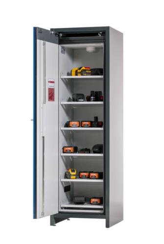Die wichtigsten Maße auf einen Blick:Die Belüftung wird über die eingebaute Zu- und Abluft im Schrankdach geregelt. Dank der Flügeltür haben Sie eine staubgeschützte Lagerung und Übersichtlichkeit in Einem, Türanschlag links. Sicher verschließbar mit Profilzylinderschloss mit Schließzustandsanzeige (rot/grün), Die 2-Punkt-Sicherheitsverriegelung bietet hohe Stabilität und einen effektiven Einbruchschutz. Türanschlag links. Für eine optimale Sicherheitsausstattung des Batterieschrankes sorgen das integrierte Brandwarnsystem und die selbstschließenden Türen. 6 Ebene(n) mit gelochtem Stahlboden, unten 1 Ebene mit Bodenwanne. Auffangvolumen Bodenwanne 1 l. Ausgestattet mit Böden, Bodenwanne. Unterbau Mit den integrierten Stellfüßen lassen sich Bodenunebenheiten einfach ausgleichen und ermöglichen einen geraden und ausgerichteten Stand.