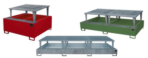 "description": "f. 3xIBC, Auffangvol. 1000l, HxBxT 780x3850x1460mm, m. 3 Abfüllgestellen, Stahl, RAL6011",