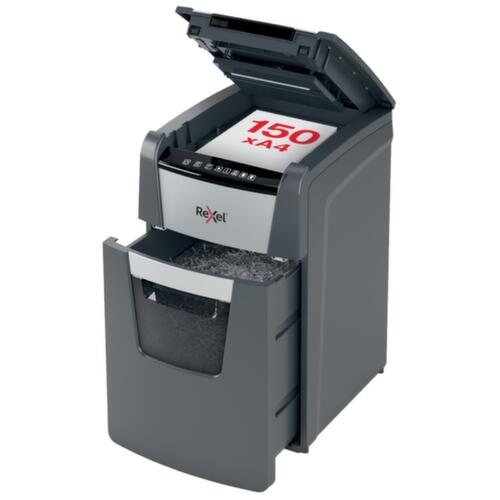 Die wichtigsten Maße des Aktenvernichters Optimum AutoFeed+ 150M auf einen Blick:Sicherheitsstufe: Die Sicherheitsstufe P-5 reduziert die maximale Breite auf 2 mm und die Fläche pro Partikel auf 30 mm². Somit müssen aus einem DIN A4-Blatt zur Erfüllung dieser Sicherheitsstufe 2100 Partikel entstehen. Leistung 300 W.