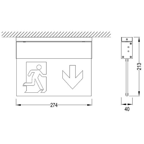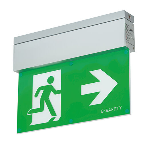 Symbol/Text: "Notausgang". Richtungsangabe über Pfeil rechts/links. Decke.