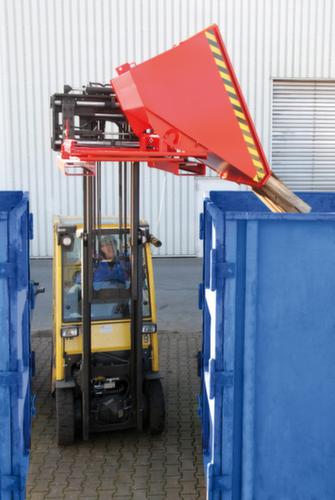 Der Kippvorgang wird bequem vom Fahrersitz aus per Zugseilentriegelung ausgelöst. Durch die praktische Drehfunktion ist ein Abkippen zu seitlich gelegenen Containern kein Problem. Lästiges rangieren mit dem Stapler entfällt – die Kipprichtung kann nach vorne, links oder rechts eingestellt werden. Durch die Kippsicherung wird sichergestellt, dass der Behälter während des Transportes nicht unbeabsichtigt auskippt. Mit einer Sicherungskette an den Einfahrtaschen kann der Kippbehälter zusätzlich am Stapler gegen Abrutschen gesichert werden . Hohe Stabilität durch umlaufende gekantete Randverstärkung. Robuste Konstruktion aus Stahl mit Lackierung in RAL3000 Feuerrot. Zum einfachen Transportieren und Entleeren nehmen Sie den Kippbehälter einfach mit dem Stapler über die Einfahrtaschen auf und bringen ihn auf die gewünschte Position und erforderliche Höhe.