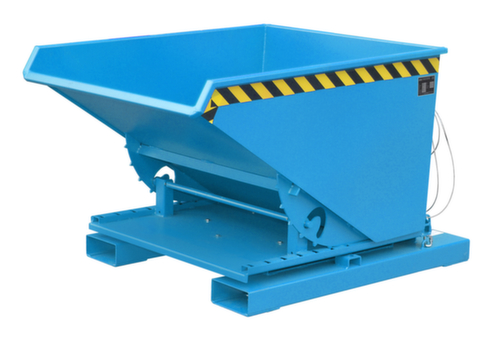 Der Kippvorgang wird bequem vom Fahrersitz aus per Zugseilentriegelung ausgelöst. Durch die praktische Drehfunktion ist ein Abkippen zu seitlich gelegenen Containern kein Problem. Lästiges rangieren mit dem Stapler entfällt – die Kipprichtung kann nach vorne, links oder rechts eingestellt werden. Durch die Kippsicherung wird sichergestellt, dass der Behälter während des Transportes nicht unbeabsichtigt auskippt. Mit einer Sicherungskette an den Einfahrtaschen kann der Kippbehälter zusätzlich am Stapler gegen Abrutschen gesichert werden . Hohe Stabilität durch umlaufende gekantete Randverstärkung. Robuste Konstruktion aus Stahl mit Lackierung in RAL5012 Lichtblau. Zum einfachen Transportieren und Entleeren nehmen Sie den Kippbehälter einfach mit dem Stapler über die Einfahrtaschen auf und bringen ihn auf die gewünschte Position und erforderliche Höhe.