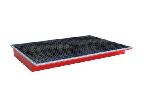 Mit der einhängbaren Auffangwanne rüsten Sie Palettenregale oder andere Regalsysteme schnell und gesetzteskonform für die Lagerung von Gefahrstoffen um. Im Gegensatz zu anderen Auffangwannen wird die Einhängewanne nicht unter das Regal, sondern direkt als eigene Ebene auf die Längstraversen aufgelegt. Durch den Überstand an den Längsseiten entsteht eine sichere Auflagefläche. Die Wanne ist damit zwischen den Längstraversen eingelassen und ein verrutschen ist nicht möglich.