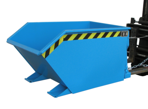 Die wichtigsten Maße des Bauer Kippbehälters auf einen BlickDer Kippvorgang wird bequem vom Fahrersitz aus per Zugseilentriegelung ausgelöst. Die besondere Anordnung des Drehpunktes sorgt für einen günstigen Kippwinkel und damit für eine schnelle und restlose Entleerung. Das Rückführen in die Grundposition wird durch das Absenken auf den Boden erreicht und die Kippsicherung rastet wieder automatisch ein. Mit einer Sicherungskette an den Einfahrtaschen kann der Kippbehälter zusätzlich am Stapler gegen Abrutschen gesichert werden . Hohe Stabilität durch umlaufende gekantete Randverstärkung und stabilen Grundrahmen. Robuste Konstruktion aus Stahl mit Lackierung in RAL5012 Lichtblau. Zum einfachen Transportieren und Entleeren nehmen Sie den Kippbehälter einfach mit dem Stapler über die Einfahrtaschen auf und bringen ihn auf die gewünschte Position und erforderliche Höhe.