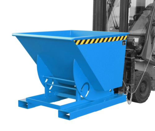 Der Kippvorgang wird bequem vom Fahrersitz aus per Zugseilentriegelung ausgelöst. Die Abrollkufen gewährleisten durch Ausnutzung des günstigen Lastenschwerpunktes eine sanftes Abkippen. Nach der Entleerung schwenkt der Kippbehälter automatisch wieder in die Ausgangsposition zurück und die Kippsicherung rastet wieder automatisch ein. Mit einer Sicherungskette an den Einfahrtaschen kann der Kippbehälter zusätzlich am Stapler gegen Abrutschen gesichert werden . Hohe Stabilität durch umlaufende gekantete Randverstärkung. Robuste Konstruktion aus Stahl mit Lackierung in RAL5012 Lichtblau. Zum einfachen Transportieren und Entleeren nehmen Sie den Kippbehälter einfach mit dem Stapler über die Einfahrtaschen auf und bringen ihn auf die gewünschte Position und erforderliche Höhe.