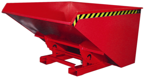 Der Kippvorgang wird bequem vom Fahrersitz aus per Zugseilentriegelung ausgelöst. Die Abrollkufen gewährleisten durch Ausnutzung des günstigen Lastenschwerpunktes eine sanftes Abkippen. Nach der Entleerung schwenkt der Kippbehälter automatisch wieder in die Ausgangsposition zurück und die Kippsicherung rastet wieder automatisch ein. Mit einer Sicherungskette an den Einfahrtaschen kann der Kippbehälter zusätzlich am Stapler gegen Abrutschen gesichert werden . Hohe Stabilität durch umlaufende gekantete Randverstärkung und stabilen Grundrahmen. Robuste Konstruktion aus Stahl mit Lackierung in RAL3000 Feuerrot. Zum einfachen Transportieren und Entleeren nehmen Sie den Kippbehälter einfach mit dem Stapler über die Einfahrtaschen auf und bringen ihn auf die gewünschte Position und erforderliche Höhe.