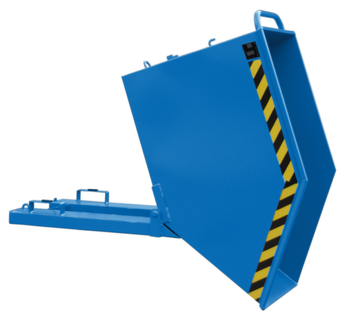 Die wichtigsten Maße des Bauer Kippbehälters auf einen BlickDer Kippvorgang wird bequem über eine Handgriff an der Rückseite manuell ausgelöst. Zum Schutz vor unbeabsichtigtem Auskippen rastet die Federkippsicherung beim Zurückführen des Behälters automatisch ein. Der Kippbehälter ist auch für die Aufnahme von Flüssigkeiten geeignet - öl- und wasserdicht verschweißt. Hohe Stabilität durch umlaufende gekantete Randverstärkung. Robuste Konstruktion aus Stahl mit Lackierung in RAL5012 Lichtblau. Zum einfachen Transportieren und Entleeren nehmen Sie den Kippbehälter einfach mit dem Stapler über die Einfahrtaschen auf und bringen ihn auf die gewünschte Position und erforderliche Höhe.