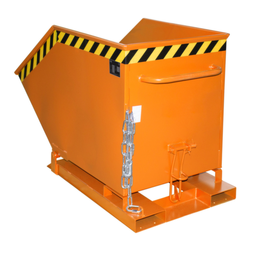 Die wichtigsten Maße des Bauer Kippbehälters auf einen BlickDer Kippvorgang wird bequem über eine Handgriff an der Rückseite manuell ausgelöst. Zum Schutz vor unbeabsichtigtem Auskippen rastet die Federkippsicherung beim Zurückführen des Behälters automatisch ein. Der Kippbehälter ist auch für die Aufnahme von Flüssigkeiten geeignet - öl- und wasserdicht verschweißt. Hohe Stabilität durch umlaufende gekantete Randverstärkung. Robuste Konstruktion aus Stahl mit Lackierung in RAL2000 Gelborange. Zum einfachen Transportieren und Entleeren nehmen Sie den Kippbehälter einfach mit dem Stapler über die Einfahrtaschen auf und bringen ihn auf die gewünschte Position und erforderliche Höhe.