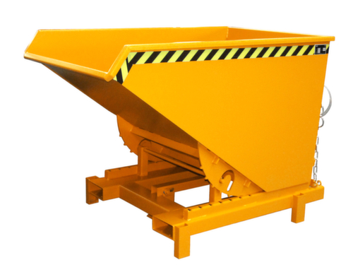 Beim Aufsetzen des Kippbehälters auf dem Containerrand löst der Auslösefuß die Entriegelung und setzt eine automatische Entleerung in Gang. So wird Ihr Arbeitsprozess bequem beschleunigt und erhöht die Sicherheit in Ihrem Betrieb. Alternativ lässt sich der Behälter jederzeit manuell über eine Zugseilentriegelung entleeren. Die Abrollkufen gewährleisten durch Ausnutzung des günstigen Lastenschwerpunktes eine sanftes Abkippen. Nach der Entleerung schwenkt der Kippbehälter automatisch wieder in die Ausgangsposition zurück und die Kippsicherung rastet wieder automatisch ein. Robuste Konstruktion aus Stahl mit Lackierung in RAL2000 Gelborange. Zum einfachen Transportieren und Entleeren nehmen Sie den Kippbehälter einfach mit dem Stapler über die Einfahrtaschen auf und bringen ihn auf die gewünschte Position und erforderliche Höhe.