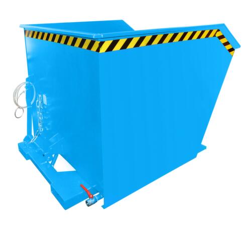 Der Kippvorgang wird bequem vom Fahrersitz aus per Zugseilentriegelung ausgelöst. Die besondere Anordnung des Drehpunktes sorgt für einen günstigen Kippwinkel und damit für eine schnelle und restlose Entleerung. Durch die Kippsicherung wird sichergestellt, dass der Behälter während des Transportes nicht unbeabsichtigt auskippt. Der Kippbehälter ist auch für die Aufnahme von Flüssigkeiten geeignet - öl- und wasserdicht verschweißt. Aufgefangene Flüssigkeiten, wie Öl oder Wasser, werden durch ein Sieb von den Feststoffen getrennt und können zeitsparend über ein Ablasshahn abgelassen werden, ohne den Container kippen zu müssen. Wände geschlossen. Hohe Stabilität durch umlaufende gekantete Randverstärkung und stabilen Grundrahmen. Mobil einsetzbar. Zum einfachen Transportieren mit Einfahrtaschen ausgestattet.