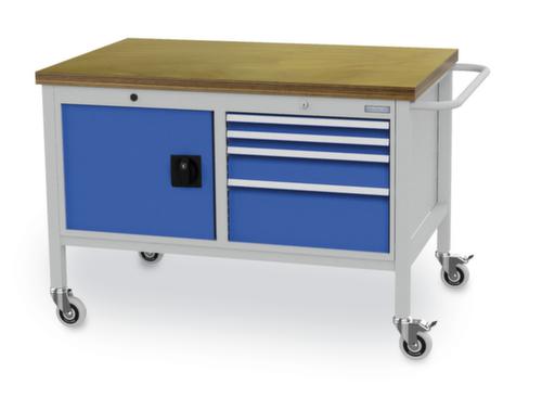 "description": "fahrbar, HxBxT 859x1250x750mm, Multiplexplatte, Tragl. 500kg, 4-Fuß, Ausstattung: 4 Schubladen, Schrank, RAL7035, Front RAL5012,4 Lenkrollen",