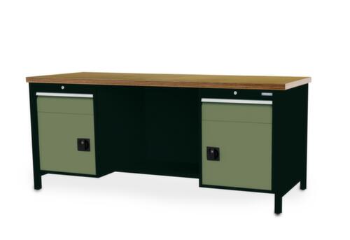 4-Fußgestell. Ausstattung: 2 Schubladen, 2 Schränke, 1/2 Ablageboden. Links 1 Schublade, 1 Schrank. Mitte 1/2 Ablageboden. Rechts 1 Schublade, 1 Schrank. Schubladen Höhe 2x150 mm. Schubladennutzmaß Breite x Tiefe 600 x 600 mm. Traglast je Schublade 100 kg. Schubladen mit kugelgelagerter Rollenführung, Auszug 100 %. Schubladen zur Aufnahme von Einteilungsmaterial geschlitzt. Mit Die Einzelauszugsperre verhindert, dass mehrere Schubladen gleichzeitig geöffnet werden und damit ein Umkippen. Griffleiste. Beschriftungsstreifen. Verschließbar mit Zylinderschloss. Konstruktion aus Stahl.