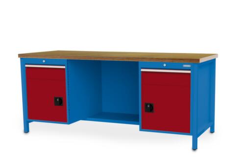 4-Fußgestell. Ausstattung: 2 Schubladen, 2 Schränke, 1/2 Ablageboden. Links 1 Schublade, 1 Schrank. Mitte 1/2 Ablageboden. Rechts 1 Schublade, 1 Schrank. Schubladen Höhe 2x150 mm. Schubladennutzmaß Breite x Tiefe 600 x 600 mm. Traglast je Schublade 100 kg. Schubladen mit kugelgelagerter Rollenführung, Auszug 100 %. Schubladen zur Aufnahme von Einteilungsmaterial geschlitzt. Mit Die Einzelauszugsperre verhindert, dass mehrere Schubladen gleichzeitig geöffnet werden und damit ein Umkippen. Griffleiste. Beschriftungsstreifen. Verschließbar mit Zylinderschloss. Konstruktion aus Stahl.