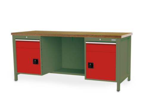 4-Fußgestell. Ausstattung: 2 Schubladen, 2 Schränke, 1/2 Ablageboden. Links 1 Schublade, 1 Schrank. Mitte 1/2 Ablageboden. Rechts 1 Schublade, 1 Schrank. Schubladen Höhe 2x150 mm. Schubladennutzmaß Breite x Tiefe 600 x 600 mm. Traglast je Schublade 100 kg. Schubladen mit kugelgelagerter Rollenführung, Auszug 100 %. Schubladen zur Aufnahme von Einteilungsmaterial geschlitzt. Mit Die Einzelauszugsperre verhindert, dass mehrere Schubladen gleichzeitig geöffnet werden und damit ein Umkippen. Griffleiste. Beschriftungsstreifen. Verschließbar mit Zylinderschloss. Konstruktion aus Stahl.