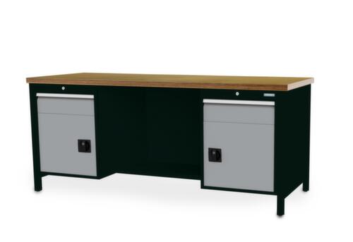 4-Fußgestell. Ausstattung: 2 Schubladen, 2 Schränke, 1/2 Ablageboden. Links 1 Schublade, 1 Schrank. Mitte 1/2 Ablageboden. Rechts 1 Schublade, 1 Schrank. Schubladen Höhe 2x150 mm. Schubladennutzmaß Breite x Tiefe 600 x 600 mm. Traglast je Schublade 100 kg. Schubladen mit kugelgelagerter Rollenführung, Auszug 100 %. Schubladen zur Aufnahme von Einteilungsmaterial geschlitzt. Mit Die Einzelauszugsperre verhindert, dass mehrere Schubladen gleichzeitig geöffnet werden und damit ein Umkippen. Griffleiste. Beschriftungsstreifen. Verschließbar mit Zylinderschloss. Konstruktion aus Stahl.
