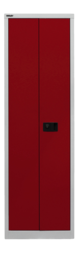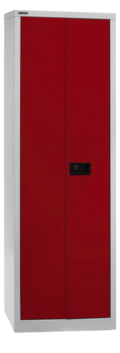 Konstruktion aus Stahl. Mit Doppel-Flügeltür. Traglast je Ebene 70 kg. Im Raster von 25 mm verstellbar. Mit Klappgriff. Verschließbar mit Zylinderschloss. Die 3-Punkt-Verriegelung bietet hohe Stabilität und einen effektiven Einbruchschutz. Unterbau: Der untergebaute Sockel sorgt dafür, dass das Gewicht des Schrankes gleichmäßig auf dem Boden verteilt wird. Dies erhöht die Stabilität und der Schrank kann schwerer Lasten aufnehmen, als ein Schrank mit Füßen. Außerdem können Schmutz, Staub und Feuchtigkeit nicht unter den Schrank gelangen, was die Reinigungsfläche verkleinert. Korpus mit Lackierung in lichtgrau. Front mit Lackierung in anthrazitgrau. Ebenen mit Lackierung in lichtgrau.