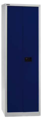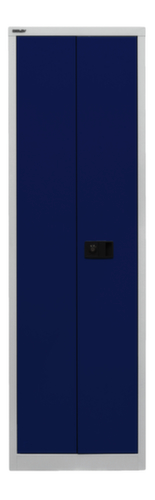 Konstruktion aus Stahl. Mit Doppel-Flügeltür. Traglast je Ebene 70 kg. Im Raster von 25 mm verstellbar. Mit Klappgriff. Verschließbar mit Zylinderschloss. Die 3-Punkt-Verriegelung bietet hohe Stabilität und einen effektiven Einbruchschutz. Unterbau: Der untergebaute Sockel sorgt dafür, dass das Gewicht des Schrankes gleichmäßig auf dem Boden verteilt wird. Dies erhöht die Stabilität und der Schrank kann schwerer Lasten aufnehmen, als ein Schrank mit Füßen. Außerdem können Schmutz, Staub und Feuchtigkeit nicht unter den Schrank gelangen, was die Reinigungsfläche verkleinert. Korpus mit Lackierung in lichtgrau. Front mit Lackierung in oxfordblau. Ebenen mit Lackierung in lichtgrau.