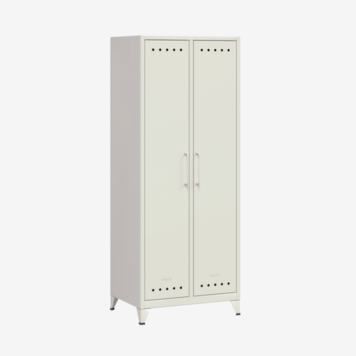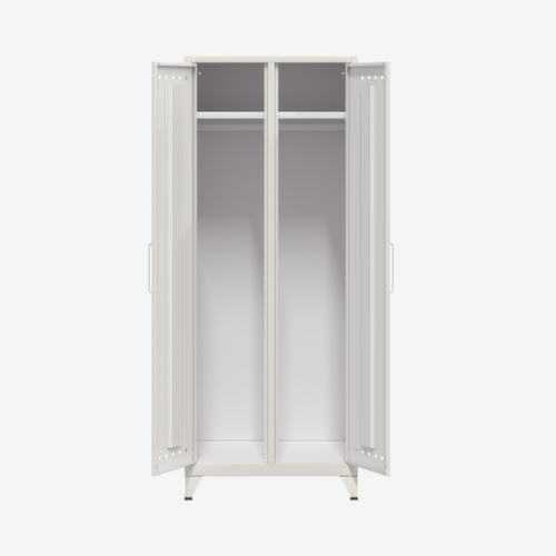 Die wichtigsten Maße des Bisley Wäscheschranks Fern Maxi auf einen Blick:Je Abteil Hutboden und Kleiderstange. Mit Mitteltrennwand. Staubgeschützt zu schließen über Doppel-Flügeltür. Tür bündig mit dem Korpus abschließend. Mit Griffen. Über die Design-Lüftungslöcher in der Tür kann eine kontinuierliche Luftzirkulation stattfinden. 4 Füße sorgen für einen sicheren Stand. Konstruktion aus Stahl, verschweißt. Korpus mit Lackierung in verkehrsweiß, Front mit Lackierung in verkehrsweiß.