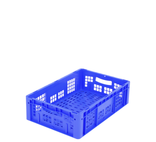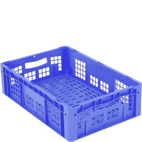 Maßlich auf die Europalette abgestimmt. Aus bruchsicherem Polypropylen in blau. Wände durchbrochen, Boden durchbrochen. Boden mit Verstärkung durch doppelte Verstärkungsrippen. Einfacher Transport durch Durchfassgriffe. Mehrfach stapelbar. Lebensmittelgeeignet. Temperaturbeständig -20 °C bis +80 °C. Geeignet für verschiedene Stoffe, bitte anfragen.