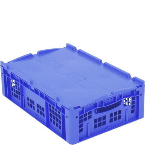 Maßlich auf die Europalette abgestimmt. Aus bruchsicherem Polypropylen in blau. Wände durchbrochen, Boden durchbrochen. Boden mit Verstärkung durch doppelte Verstärkungsrippen. Das Lagergut ist vor Staub und Schmutz geschützt durch den zweiteiligen Scharnierdeckel. Einfacher Transport durch Durchfassgriffe. Mehrfach stapelbar. Lebensmittelgeeignet.