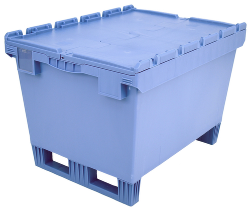 Im Euromaß. Aus bruchsicherem Polypropylen in taubenblau. Das Lagergut lässt sich durch die geschlossenen Wände vor Staub geschützt lagern und der Behälter lässt sich leicht reinigen. Boden geschlossen mit Verstärkung durch Doppelboden. Krokodildeckel. Für das einfache Versetzen und Einfahren mit einem Stapler sorgen die Kufen. Platzsparend ineinander stapelbar. Für Rollenbahnen geeignet.