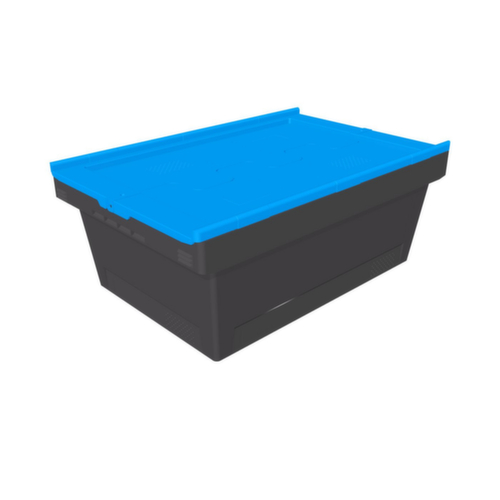 Aus Polypropylen-Regenerat. Das Lagergut lässt sich durch die geschlossenen Wände vor Staub geschützt lagern und der Behälter lässt sich leicht reinigen. Boden geschlossen. Zweiteiliger Klappdeckel in blau. Deckel aus Neugranulat. Mehrfach stapelbar. Mit offenem Deckel ineinander stapelbar.