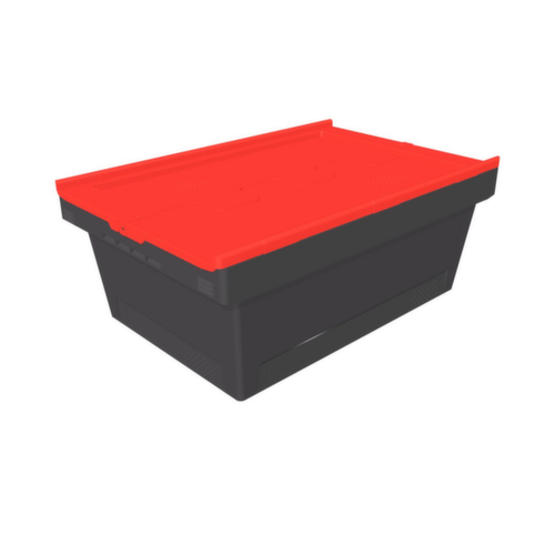 Aus Polypropylen-Regenerat. Das Lagergut lässt sich durch die geschlossenen Wände vor Staub geschützt lagern und der Behälter lässt sich leicht reinigen. Boden geschlossen. Zweiteiliger Klappdeckel in rot. Deckel aus Neugranulat. Mehrfach stapelbar. Mit offenem Deckel ineinander stapelbar.