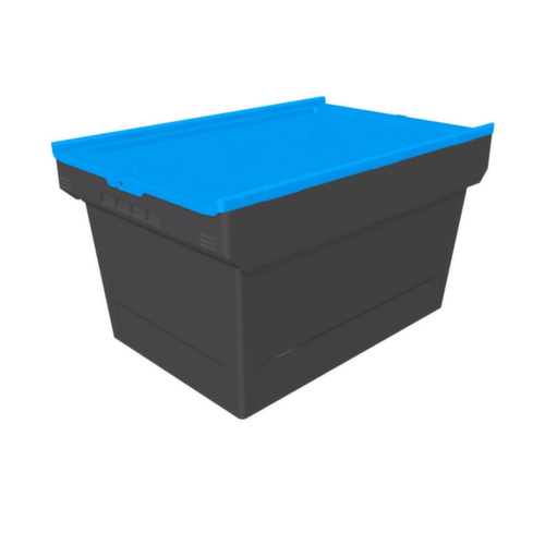 Aus Polypropylen-Regenerat. Das Lagergut lässt sich durch die geschlossenen Wände vor Staub geschützt lagern und der Behälter lässt sich leicht reinigen. Boden geschlossen. Zweiteiliger Klappdeckel in blau. Deckel aus Neugranulat. Mehrfach stapelbar. Mit offenem Deckel ineinander stapelbar.