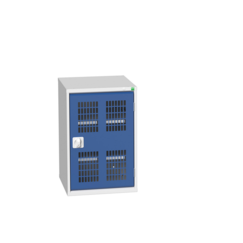 Der Schrankkorpus ist aus Stahl gefertigt und stabil verschweißt. Das macht die Konstruktion besonders robust und widerstandsfähig und somit langlebiger. Die verschweißten Ecken und Kanten des Korpus gewährleisten eine höhere Dichtigkeit und somit eine bessere Schutzfunktion gegen Staub, Feuchtigkeit und Schmutz als eine geschraubte Konstruktion. Zudem sind keine regelmäßigen Wartungsarbeiten und Nachjustierungen nötig. Flügeltür mit Lüftungsschlitzen. Verschließbar mit Drehriegelschloss. Der untergebaute Sockel sorgt dafür, dass das Gewicht des Schrankes gleichmäßig auf dem Boden verteilt wird. Dies erhöht die Stabilität und der Schrank kann schwerer Lasten aufnehmen, als ein Schrank mit Füßen. Außerdem können Schmutz, Staub und Feuchtigkeit nicht unter den Schrank gelangen, was die Reinigungsfläche verkleinert.