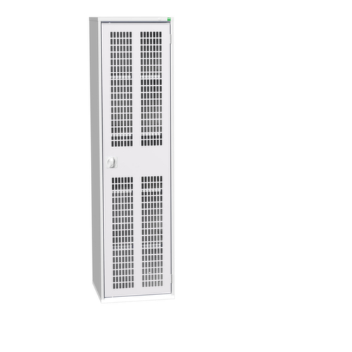 Der Schrankkorpus ist aus Stahl gefertigt und stabil verschweißt. Das macht die Konstruktion besonders robust und widerstandsfähig und somit langlebiger. Die verschweißten Ecken und Kanten des Korpus gewährleisten eine höhere Dichtigkeit und somit eine bessere Schutzfunktion gegen Staub, Feuchtigkeit und Schmutz als eine geschraubte Konstruktion. Zudem sind keine regelmäßigen Wartungsarbeiten und Nachjustierungen nötig. Flügeltür mit Lüftungsschlitzen. Verschließbar mit Drehriegelschloss. Der untergebaute Sockel sorgt dafür, dass das Gewicht des Schrankes gleichmäßig auf dem Boden verteilt wird. Dies erhöht die Stabilität und der Schrank kann schwerer Lasten aufnehmen, als ein Schrank mit Füßen. Außerdem können Schmutz, Staub und Feuchtigkeit nicht unter den Schrank gelangen, was die Reinigungsfläche verkleinert.