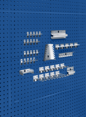 "title": "bott Lochplatte mit 42 teiligem Hakensortiment, Höhe x Breite 991 x 914 mm, RAL5010 Enzianblau",