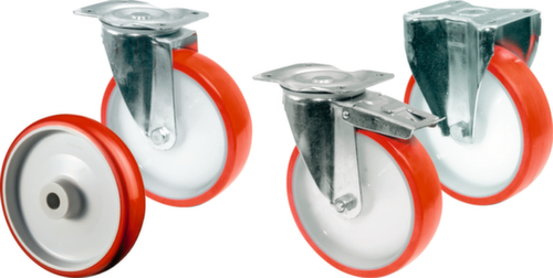 "longDescription": "<h2>Polyurethan-Räder</h2><strong>mit bruchfestem Radkörper</strong><br><ul><li><strong>Langlebig und rostfrei</strong> - Lenkgehäuse und Bockgabeln aus verzinktem Stahlblech</li><li>Felge aus Kunststoff</li><li><strong>Hoch belastbar mit geräuscharmem Lauf</strong> - mit Polyurethanbereifung</li><li><strong>Wartungsfrei und leichtgängig</strong> - Nabe mit Rollenlager</li><li>Zweireihiger Kugelkranz im Gabelkopf</li></ul>",