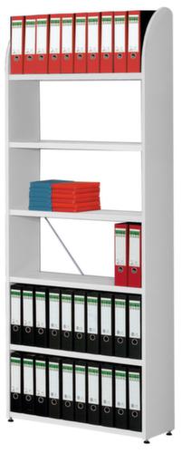 Die wichtigsten Maße des Büroregals auf einen Blick:Aktenordner und anderes Arbeitsmaterial werden auf 6 Ebene(n) mit Stahlboden übersichtlich organisiert und sind immer schnell im Zugriff. Nutzung einseitig - zur Aufstellung an der Wand konzipiert. Rückwand offen. Konstruktion aus Holz und Stahl. Korpus mit pflegeleichter Melaminharzbeschichtung in RAL7035 Lichtgrau. Ebenen mit schlag- und kratzfester Pulverbeschichtung in RAL7035 Lichtgrau. Seitenwangen mit Höhennivellierfüßen zum einfachen Ausgleich von Bodenunebenheiten.