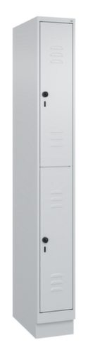 Die wichtigsten Maße des C+P Garderobenschranks Classic Plus auf einen Blick:Je Abteil 2 Schrankfächer mit je einer Kleiderstange und 3 verdrehsicheren Doppelschiebehaken. Flügeltür mit Etikettenrahmen und Lüftungsschlitzen. Die innenliegenden Drehbolzen der einschlagenden Türen bieten den Vorteil einer sauberen Optik, da keine Schrauben oder Scharniere von außen sichtbar sind. Dadurch wird das Design des Schrankes nicht beeinträchtigt und das gesamte Möbelstück wirkt hochwertiger. Damit ist auch die glatte Oberfläche leichter zu reinigen, da keine Schmutz- oder Staubablagerungen an unzugänglichen Stellen zu befürchten sind. Jede Tür ist serienmäßig mit einer Anschlagsdämpfung ausgestattet, so dass, auch durch ein schwungvolles Schließen, die Tür nicht zuknallt. Das trägt nicht nur zu einer angenehmeren Geräuschkulisse bei, sondern schont auch den Stahlschrank vor Beschädigungen. Von der Natur inspiriert schafft der BIONIC Steel Frame eine besonders effiziente und stabile Konstruktion. Durch eine raffinierte innere Struktur aus Faltungen, Streben und Zwischenräumen, sowie höhere Materialstärke an entscheidenden Stellen, wie z. B. im vorderen Bereich der Seitenwände und in den Trennwand- und Kastenprofilen, wird die Verwindungssteifigkeit zusätzlich erhöht. Verschließbar mit Sicherheits-Drehriegel für Vorhängeschloss. Das Sicherheitsschloss ist besonders aufbruchsicher, da es im verschlossenen Zustand durchdreht und erst nach Entfernung des Schlosses einrastet. Passend für alle Vorhängeschlösser mit einer Bügelstärke von 6 - 8 mm. Die zusätzlichen Lüftungsöffnungen im Abteil, kombiniert mit den Lüftungsschlitzen in der Tür, verbessern den Luftstrom. Dadurch wird der Schrankinhalt besser belüftet und trocknet schneller, ohne unangenehme Gerüche zu verursachen. Der untergebaute Sockel sorgt dafür, dass das Gewicht des Schrankes gleichmäßig auf dem Boden verteilt wird. Dies erhöht die Stabilität und der Schrank kann schwerer Lasten aufnehmen, als ein Schrank mit Füßen. Außerdem können Schmutz, Staub und Feuchtigkeit nicht unter den Schrank gelangen, was die Reinigungsfläche verkleinert. Konstruktion aus Stahl, stabil verschweißt. Das macht die Konstruktion besonders robust und widerstandsfähig und somit langlebiger. Die verschweißten Ecken und Kanten des Korpus gewährleisten eine höhere Dichtigkeit und somit eine bessere Schutzfunktion gegen Staub, Feuchtigkeit und Schmutz als eine geschraubte Konstruktion. Zudem sind keine regelmäßigen Wartungsarbeiten und Nachjustierungen nötig. Korpus mit Einbrennlackierung in RAL7035 Lichtgrau, Front mit Einbrennlackierung in RAL7035 Lichtgrau.