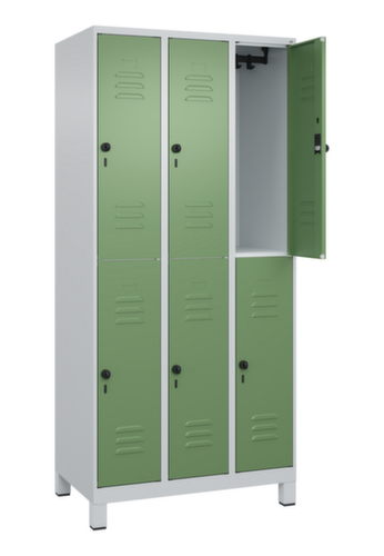 Die wichtigsten Maße des C+P Garderobenschranks Classic Plus auf einen Blick:Je Abteil 2 Schrankfächer mit je einer Kleiderstange und 3 verdrehsicheren Doppelschiebehaken. Flügeltür mit Etikettenrahmen und Lüftungsschlitzen. Die innenliegenden Drehbolzen der einschlagenden Türen bieten den Vorteil einer sauberen Optik, da keine Schrauben oder Scharniere von außen sichtbar sind. Dadurch wird das Design des Schrankes nicht beeinträchtigt und das gesamte Möbelstück wirkt hochwertiger. Damit ist auch die glatte Oberfläche leichter zu reinigen, da keine Schmutz- oder Staubablagerungen an unzugänglichen Stellen zu befürchten sind. Jede Tür ist serienmäßig mit einer Anschlagsdämpfung ausgestattet, so dass, auch durch ein schwungvolles Schließen, die Tür nicht zuknallt. Das trägt nicht nur zu einer angenehmeren Geräuschkulisse bei, sondern schont auch den Stahlschrank vor Beschädigungen. Von der Natur inspiriert schafft der BIONIC Steel Frame eine besonders effiziente und stabile Konstruktion. Durch eine raffinierte innere Struktur aus Faltungen, Streben und Zwischenräumen, sowie höhere Materialstärke an entscheidenden Stellen, wie z. B. im vorderen Bereich der Seitenwände und in den Trennwand- und Kastenprofilen, wird die Verwindungssteifigkeit zusätzlich erhöht. Verschließbar mit Sicherheits-Drehriegel für Vorhängeschloss. Das Sicherheitsschloss ist besonders aufbruchsicher, da es im verschlossenen Zustand durchdreht und erst nach Entfernung des Schlosses einrastet. Passend für alle Vorhängeschlösser mit einer Bügelstärke von 6 - 8 mm. Die zusätzlichen Lüftungsöffnungen im Abteil, kombiniert mit den Lüftungsschlitzen in der Tür, verbessern den Luftstrom. Dadurch wird der Schrankinhalt besser belüftet und trocknet schneller, ohne unangenehme Gerüche zu verursachen. Die untergebauten Füße aus Kunststoff verleihen dem Schrank nicht nur ein modernes und leichtes Erscheinungsbild und lassen ihn weniger massiv wirken, sondern bieten auch praktische Vorteile. Der offene Raum über dem Boden erleichtert die Reinigung und das Material Kunststoff bietet einen erhöhten Korrosionsschutz. Gerade in Umgebungen mit höheren Hygieneansprüchen ist dies ein wichtiger Aspekt. Konstruktion aus Stahl, stabil verschweißt. Das macht die Konstruktion besonders robust und widerstandsfähig und somit langlebiger. Die verschweißten Ecken und Kanten des Korpus gewährleisten eine höhere Dichtigkeit und somit eine bessere Schutzfunktion gegen Staub, Feuchtigkeit und Schmutz als eine geschraubte Konstruktion. Zudem sind keine regelmäßigen Wartungsarbeiten und Nachjustierungen nötig. Korpus mit Einbrennlackierung in RAL7035 Lichtgrau, Front mit Einbrennlackierung in RAL6011 Resedagrün.