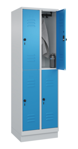 Die wichtigsten Maße des C+P Garderobenschranks Classic Plus auf einen Blick:Je Abteil 2 Schrankfächer mit je einer Kleiderstange und 3 verdrehsicheren Doppelschiebehaken. Flügeltür mit Etikettenrahmen und Lüftungsschlitzen. Die innenliegenden Drehbolzen der einschlagenden Türen bieten den Vorteil einer sauberen Optik, da keine Schrauben oder Scharniere von außen sichtbar sind. Dadurch wird das Design des Schrankes nicht beeinträchtigt und das gesamte Möbelstück wirkt hochwertiger. Damit ist auch die glatte Oberfläche leichter zu reinigen, da keine Schmutz- oder Staubablagerungen an unzugänglichen Stellen zu befürchten sind. Jede Tür ist serienmäßig mit einer Anschlagsdämpfung ausgestattet, so dass, auch durch ein schwungvolles Schließen, die Tür nicht zuknallt. Das trägt nicht nur zu einer angenehmeren Geräuschkulisse bei, sondern schont auch den Stahlschrank vor Beschädigungen. Von der Natur inspiriert schafft der BIONIC Steel Frame eine besonders effiziente und stabile Konstruktion. Durch eine raffinierte innere Struktur aus Faltungen, Streben und Zwischenräumen, sowie höhere Materialstärke an entscheidenden Stellen, wie z. B. im vorderen Bereich der Seitenwände und in den Trennwand- und Kastenprofilen, wird die Verwindungssteifigkeit zusätzlich erhöht. Verschließbar mit Sicherheits-Drehriegel für Vorhängeschloss. Das Sicherheitsschloss ist besonders aufbruchsicher, da es im verschlossenen Zustand durchdreht und erst nach Entfernung des Schlosses einrastet. Passend für alle Vorhängeschlösser mit einer Bügelstärke von 6 - 8 mm. Die zusätzlichen Lüftungsöffnungen im Abteil, kombiniert mit den Lüftungsschlitzen in der Tür, verbessern den Luftstrom. Dadurch wird der Schrankinhalt besser belüftet und trocknet schneller, ohne unangenehme Gerüche zu verursachen. Der untergebaute Sockel sorgt dafür, dass das Gewicht des Schrankes gleichmäßig auf dem Boden verteilt wird. Dies erhöht die Stabilität und der Schrank kann schwerer Lasten aufnehmen, als ein Schrank mit Füßen. Außerdem können Schmutz, Staub und Feuchtigkeit nicht unter den Schrank gelangen, was die Reinigungsfläche verkleinert. Konstruktion aus Stahl, stabil verschweißt. Das macht die Konstruktion besonders robust und widerstandsfähig und somit langlebiger. Die verschweißten Ecken und Kanten des Korpus gewährleisten eine höhere Dichtigkeit und somit eine bessere Schutzfunktion gegen Staub, Feuchtigkeit und Schmutz als eine geschraubte Konstruktion. Zudem sind keine regelmäßigen Wartungsarbeiten und Nachjustierungen nötig. Korpus mit Einbrennlackierung in RAL7035 Lichtgrau, Front mit Einbrennlackierung in RAL5012 Lichtblau.