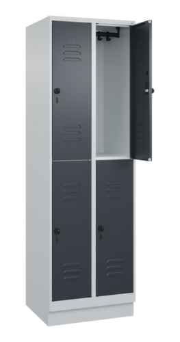 Die wichtigsten Maße des C+P Garderobenschranks Classic Plus auf einen Blick:Je Abteil 2 Schrankfächer mit je einer Kleiderstange und 3 verdrehsicheren Doppelschiebehaken. Flügeltür mit Etikettenrahmen und Lüftungsschlitzen. Die innenliegenden Drehbolzen der einschlagenden Türen bieten den Vorteil einer sauberen Optik, da keine Schrauben oder Scharniere von außen sichtbar sind. Dadurch wird das Design des Schrankes nicht beeinträchtigt und das gesamte Möbelstück wirkt hochwertiger. Damit ist auch die glatte Oberfläche leichter zu reinigen, da keine Schmutz- oder Staubablagerungen an unzugänglichen Stellen zu befürchten sind. Jede Tür ist serienmäßig mit einer Anschlagsdämpfung ausgestattet, so dass, auch durch ein schwungvolles Schließen, die Tür nicht zuknallt. Das trägt nicht nur zu einer angenehmeren Geräuschkulisse bei, sondern schont auch den Stahlschrank vor Beschädigungen. Von der Natur inspiriert schafft der BIONIC Steel Frame eine besonders effiziente und stabile Konstruktion. Durch eine raffinierte innere Struktur aus Faltungen, Streben und Zwischenräumen, sowie höhere Materialstärke an entscheidenden Stellen, wie z. B. im vorderen Bereich der Seitenwände und in den Trennwand- und Kastenprofilen, wird die Verwindungssteifigkeit zusätzlich erhöht. Verschließbar mit Sicherheits-Drehriegel für Vorhängeschloss. Das Sicherheitsschloss ist besonders aufbruchsicher, da es im verschlossenen Zustand durchdreht und erst nach Entfernung des Schlosses einrastet. Passend für alle Vorhängeschlösser mit einer Bügelstärke von 6 - 8 mm. Die zusätzlichen Lüftungsöffnungen im Abteil, kombiniert mit den Lüftungsschlitzen in der Tür, verbessern den Luftstrom. Dadurch wird der Schrankinhalt besser belüftet und trocknet schneller, ohne unangenehme Gerüche zu verursachen. Der untergebaute Sockel sorgt dafür, dass das Gewicht des Schrankes gleichmäßig auf dem Boden verteilt wird. Dies erhöht die Stabilität und der Schrank kann schwerer Lasten aufnehmen, als ein Schrank mit Füßen. Außerdem können Schmutz, Staub und Feuchtigkeit nicht unter den Schrank gelangen, was die Reinigungsfläche verkleinert. Konstruktion aus Stahl, stabil verschweißt. Das macht die Konstruktion besonders robust und widerstandsfähig und somit langlebiger. Die verschweißten Ecken und Kanten des Korpus gewährleisten eine höhere Dichtigkeit und somit eine bessere Schutzfunktion gegen Staub, Feuchtigkeit und Schmutz als eine geschraubte Konstruktion. Zudem sind keine regelmäßigen Wartungsarbeiten und Nachjustierungen nötig. Korpus mit Einbrennlackierung in RAL7035 Lichtgrau, Front mit Einbrennlackierung in RAL7016 Anthrazitgrau.