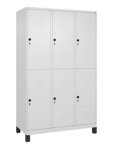 Die wichtigsten Maße des C+P Garderobenschranks Classic Plus auf einen Blick:Je Abteil 2 Schrankfächer mit je einer Kleiderstange und 3 verdrehsicheren Doppelschiebehaken. Flügeltür mit Etikettenrahmen und Lüftungsschlitzen. Die innenliegenden Drehbolzen der einschlagenden Türen bieten den Vorteil einer sauberen Optik, da keine Schrauben oder Scharniere von außen sichtbar sind. Dadurch wird das Design des Schrankes nicht beeinträchtigt und das gesamte Möbelstück wirkt hochwertiger. Damit ist auch die glatte Oberfläche leichter zu reinigen, da keine Schmutz- oder Staubablagerungen an unzugänglichen Stellen zu befürchten sind. Jede Tür ist serienmäßig mit einer Anschlagsdämpfung ausgestattet, so dass, auch durch ein schwungvolles Schließen, die Tür nicht zuknallt. Das trägt nicht nur zu einer angenehmeren Geräuschkulisse bei, sondern schont auch den Stahlschrank vor Beschädigungen. Von der Natur inspiriert schafft der BIONIC Steel Frame eine besonders effiziente und stabile Konstruktion. Durch eine raffinierte innere Struktur aus Faltungen, Streben und Zwischenräumen, sowie höhere Materialstärke an entscheidenden Stellen, wie z. B. im vorderen Bereich der Seitenwände und in den Trennwand- und Kastenprofilen, wird die Verwindungssteifigkeit zusätzlich erhöht. Verschließbar mit Sicherheits-Drehriegel für Vorhängeschloss. Das Sicherheitsschloss ist besonders aufbruchsicher, da es im verschlossenen Zustand durchdreht und erst nach Entfernung des Schlosses einrastet. Passend für alle Vorhängeschlösser mit einer Bügelstärke von 6 - 8 mm. Die zusätzlichen Lüftungsöffnungen im Abteil, kombiniert mit den Lüftungsschlitzen in der Tür, verbessern den Luftstrom. Dadurch wird der Schrankinhalt besser belüftet und trocknet schneller, ohne unangenehme Gerüche zu verursachen. Die untergebauten Füße aus Kunststoff verleihen dem Schrank nicht nur ein modernes und leichtes Erscheinungsbild und lassen ihn weniger massiv wirken, sondern bieten auch praktische Vorteile. Der offene Raum über dem Boden erleichtert die Reinigung und das Material Kunststoff bietet einen erhöhten Korrosionsschutz. Gerade in Umgebungen mit höheren Hygieneansprüchen ist dies ein wichtiger Aspekt. Konstruktion aus Stahl, stabil verschweißt. Das macht die Konstruktion besonders robust und widerstandsfähig und somit langlebiger. Die verschweißten Ecken und Kanten des Korpus gewährleisten eine höhere Dichtigkeit und somit eine bessere Schutzfunktion gegen Staub, Feuchtigkeit und Schmutz als eine geschraubte Konstruktion. Zudem sind keine regelmäßigen Wartungsarbeiten und Nachjustierungen nötig. Korpus mit Einbrennlackierung in RAL9016 Verkehrsweiß, Front mit Einbrennlackierung in RAL9016 Verkehrsweiß.