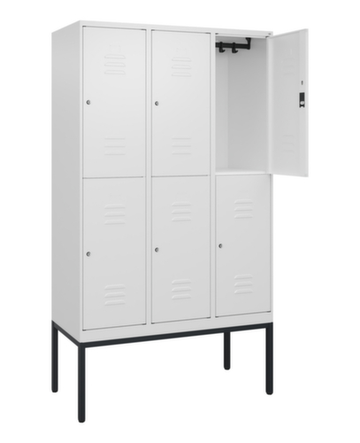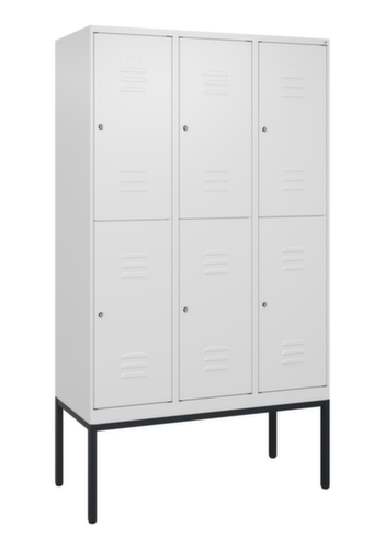Die wichtigsten Maße des C+P Garderobenschranks Classic Plus auf einen Blick:Je Abteil 2 Schrankfächer mit je einer Kleiderstange und 3 verdrehsicheren Doppelschiebehaken. Flügeltür mit Etikettenrahmen und Lüftungsschlitzen. Die innenliegenden Drehbolzen der einschlagenden Türen bieten den Vorteil einer sauberen Optik, da keine Schrauben oder Scharniere von außen sichtbar sind. Dadurch wird das Design des Schrankes nicht beeinträchtigt und das gesamte Möbelstück wirkt hochwertiger. Damit ist auch die glatte Oberfläche leichter zu reinigen, da keine Schmutz- oder Staubablagerungen an unzugänglichen Stellen zu befürchten sind. Jede Tür ist serienmäßig mit einer Anschlagsdämpfung ausgestattet, so dass, auch durch ein schwungvolles Schließen, die Tür nicht zuknallt. Das trägt nicht nur zu einer angenehmeren Geräuschkulisse bei, sondern schont auch den Stahlschrank vor Beschädigungen. Von der Natur inspiriert schafft der BIONIC Steel Frame eine besonders effiziente und stabile Konstruktion. Durch eine raffinierte innere Struktur aus Faltungen, Streben und Zwischenräumen, sowie höhere Materialstärke an entscheidenden Stellen, wie z. B. im vorderen Bereich der Seitenwände und in den Trennwand- und Kastenprofilen, wird die Verwindungssteifigkeit zusätzlich erhöht. Verschließbar mit Zylinderschloss. Die zusätzlichen Lüftungsöffnungen im Abteil, kombiniert mit den Lüftungsschlitzen in der Tür, verbessern den Luftstrom. Dadurch wird der Schrankinhalt besser belüftet und trocknet schneller, ohne unangenehme Gerüche zu verursachen. Das untergebaute Fußgestell reduziert mögliche Ansammlungen von Schmutz und Staub, da eine vollflächige Reinigung einfach möglich ist. Zudem wird zusätzlicher Stauraum unter dem Schrank geschaffen. Schuhe und Taschen stehen nicht mehr im Raum und stellen weniger Stolpergefahr dar. Konstruktion aus Stahl, stabil verschweißt. Das macht die Konstruktion besonders robust und widerstandsfähig und somit langlebiger. Die verschweißten Ecken und Kanten des Korpus gewährleisten eine höhere Dichtigkeit und somit eine bessere Schutzfunktion gegen Staub, Feuchtigkeit und Schmutz als eine geschraubte Konstruktion. Zudem sind keine regelmäßigen Wartungsarbeiten und Nachjustierungen nötig. Korpus mit Einbrennlackierung in RAL9016 Verkehrsweiß, Front mit Einbrennlackierung in RAL9016 Verkehrsweiß.