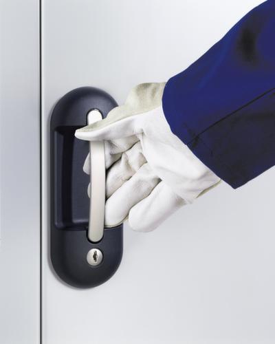 Die wichtigsten Maße des C+P Universalschrankes auf einen Blick:Der Schrankkorpus ist aus Stahlblech gefertigt und stabil verschweißt. Das macht die Konstruktion besonders robust und widerstandsfähig und somit langlebiger. Die verschweißten Ecken und Kanten des Korpus gewährleisten eine höhere Dichtigkeit und somit eine bessere Schutzfunktion gegen Staub, Feuchtigkeit und Schmutz als eine geschraubte Konstruktion. Zudem sind keine regelmäßigen Wartungsarbeiten und Nachjustierungen nötig. Hohe Flexibilität der Inneneinrichtung durch Verstellbarkeit der Fachhöhen im Raster von 10 mm. Ausgestattet mit Böden. Staubgeschützt zu schließen über Doppel-Flügeltür. Das innenliegende Kastenprofil und die allseitige Abkantung erhöhen die Steifigkeit der Türen und macht sie widerstandsfähiger gegen Verformungen. Dadurch können sie auch stärkeren Belastungen standhalten und bieten einen hohen Diebstahlschutz. Öffnen lässt sich der Magazinschrank mit Muldengriff. Verschließbar mit dem Griffschloss Ergo-Lock. Durch den großzügigen, ergonomischen Griffbügel lässt sich der Stahlschrank, auch mit Handschuhen, ganz einfach öffnen und durch den patentierten Mechanismus noch einfacher durch zudrücken wieder schließen. Für einen kontrollierten Zugriff auf den Inhalt ist das Ergo-Lock standardmäßig mit einem Sicherheitszylinderschloss ausgestattet. Die 3-Punkt-Verriegelung bietet hohe Stabilität und einen effektiven Einbruchschutz.