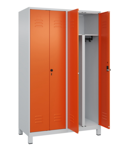 . Die wichtigsten Maße des C+P Garderobenschranks Classic Plus auf einen Blick:Je Abteil 1 stabile Garderobenstange aus Ovalprofil mit 3 verdrehsicheren Doppelschiebehaken, oberhalb ein durchgehender Hutboden über je 2 Abteile. Diese extra breite Ablage bietet den idealen Stauraum für PSA-Ausrüstung wie z. B. Helme, Augen- oder Gehörschutz. Doppel-Flügeltür mit Lüftungsschlitzen und Etikettenrahmen. Die innenliegenden Drehbolzen der einschlagenden Türen bieten den Vorteil einer sauberen Optik, da keine Schrauben oder Scharniere von außen sichtbar sind. Dadurch wird das Design des Schrankes nicht beeinträchtigt und das gesamte Möbelstück wirkt hochwertiger. Damit ist auch die glatte Oberfläche leichter zu reinigen, da keine Schmutz- oder Staubablagerungen an unzugänglichen Stellen zu befürchten sind. Jede Tür ist serienmäßig mit einer Anschlagsdämpfung ausgestattet, so dass, auch durch ein schwungvolles Schließen, die Tür nicht zuknallt. Das trägt nicht nur zu einer angenehmeren Geräuschkulisse bei, sondern schont auch den Stahlschrank vor Beschädigungen. Von der Natur inspiriert schafft der BIONIC Steel Frame eine besonders effiziente und stabile Konstruktion. Durch eine raffinierte innere Struktur aus Faltungen, Streben und Zwischenräumen, sowie höhere Materialstärke an entscheidenden Stellen, wie z. B. im vorderen Bereich der Seitenwände und in den Trennwand- und Kastenprofilen, wird die Verwindungssteifigkeit zusätzlich erhöht. Verschließbar mit Sicherheits-Drehriegel für Vorhängeschloss. Das Sicherheitsschloss ist besonders aufbruchsicher, da es im verschlossenen Zustand durchdreht und erst nach Entfernung des Schlosses einrastet. Passend für alle Vorhängeschlösser mit einer Bügelstärke von 6 - 8 mm. Pro Person stehen 2 Abteile zur Verfügung, die über die zueinander schlagenden Türen gemeinsam verschließbar sind. Dadurch ist eine strikte und saubere Trennung von Arbeits- und Alltagskleidung ganz einfach möglich. Die zusätzlichen Lüftungsöffnungen im Abteil, kombiniert mit den Lüftungsschlitzen in der Tür, verbessern den Luftstrom. Dadurch wird der Schrankinhalt besser belüftet und trocknet schneller, ohne unangenehme Gerüche zu verursachen. Die untergebauten Füße aus Kunststoff verleihen dem Schrank nicht nur ein modernes und leichtes Erscheinungsbild und lassen ihn weniger massiv wirken, sondern bieten auch praktische Vorteile. Der offene Raum über dem Boden erleichtert die Reinigung und das Material Kunststoff bietet einen erhöhten Korrosionsschutz. Gerade in Umgebungen mit höheren Hygieneansprüchen ist dies ein wichtiger Aspekt. Konstruktion aus Stahl, stabil verschweißt. Das macht die Konstruktion besonders robust und widerstandsfähig und somit langlebiger. Die verschweißten Ecken und Kanten des Korpus gewährleisten eine höhere Dichtigkeit und somit eine bessere Schutzfunktion gegen Staub, Feuchtigkeit und Schmutz als eine geschraubte Konstruktion. Zudem sind keine regelmäßigen Wartungsarbeiten und Nachjustierungen nötig. Korpus mit Einbrennlackierung in RAL7035 Lichtgrau, Front mit Einbrennlackierung in RAL2004 Reinorange.