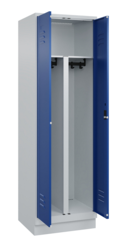 . Die wichtigsten Maße des C+P Garderobenschranks Classic Plus auf einen Blick:Je Abteil 1 stabile Garderobenstange aus Ovalprofil mit 3 verdrehsicheren Doppelschiebehaken, oberhalb ein durchgehender Hutboden über je 2 Abteile. Diese extra breite Ablage bietet den idealen Stauraum für PSA-Ausrüstung wie z. B. Helme, Augen- oder Gehörschutz. Doppel-Flügeltür mit Lüftungsschlitzen und Etikettenrahmen. Die innenliegenden Drehbolzen der einschlagenden Türen bieten den Vorteil einer sauberen Optik, da keine Schrauben oder Scharniere von außen sichtbar sind. Dadurch wird das Design des Schrankes nicht beeinträchtigt und das gesamte Möbelstück wirkt hochwertiger. Damit ist auch die glatte Oberfläche leichter zu reinigen, da keine Schmutz- oder Staubablagerungen an unzugänglichen Stellen zu befürchten sind. Jede Tür ist serienmäßig mit einer Anschlagsdämpfung ausgestattet, so dass, auch durch ein schwungvolles Schließen, die Tür nicht zuknallt. Das trägt nicht nur zu einer angenehmeren Geräuschkulisse bei, sondern schont auch den Stahlschrank vor Beschädigungen. Von der Natur inspiriert schafft der BIONIC Steel Frame eine besonders effiziente und stabile Konstruktion. Durch eine raffinierte innere Struktur aus Faltungen, Streben und Zwischenräumen, sowie höhere Materialstärke an entscheidenden Stellen, wie z. B. im vorderen Bereich der Seitenwände und in den Trennwand- und Kastenprofilen, wird die Verwindungssteifigkeit zusätzlich erhöht. Verschließbar mit Zylinderschloss. Pro Person stehen 2 Abteile zur Verfügung, die über die zueinander schlagenden Türen gemeinsam verschließbar sind. Dadurch ist eine strikte und saubere Trennung von Arbeits- und Alltagskleidung ganz einfach möglich. Die zusätzlichen Lüftungsöffnungen im Abteil, kombiniert mit den Lüftungsschlitzen in der Tür, verbessern den Luftstrom. Dadurch wird der Schrankinhalt besser belüftet und trocknet schneller, ohne unangenehme Gerüche zu verursachen. Der untergebaute Sockel sorgt dafür, dass das Gewicht des Schrankes gleichmäßig auf dem Boden verteilt wird. Dies erhöht die Stabilität und der Schrank kann schwerer Lasten aufnehmen, als ein Schrank mit Füßen. Außerdem können Schmutz, Staub und Feuchtigkeit nicht unter den Schrank gelangen, was die Reinigungsfläche verkleinert. Konstruktion aus Stahl, stabil verschweißt. Das macht die Konstruktion besonders robust und widerstandsfähig und somit langlebiger. Die verschweißten Ecken und Kanten des Korpus gewährleisten eine höhere Dichtigkeit und somit eine bessere Schutzfunktion gegen Staub, Feuchtigkeit und Schmutz als eine geschraubte Konstruktion. Zudem sind keine regelmäßigen Wartungsarbeiten und Nachjustierungen nötig. Korpus mit Einbrennlackierung in RAL7035 Lichtgrau, Front mit Einbrennlackierung in RAL5010 Enzianblau.