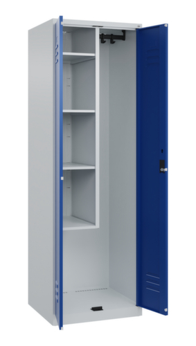 Die wichtigsten Details des C+P Putzmittelschrankes Classic Plus auf einen Blick:Über die Doppelflügeltür ist der Zugriff auf den Schrankinhalt besonders komfortabel. Die Lüftungsschlitze sorgen für eine erhöhte Belüftung und schützen somit den Inhalt des Schranks vor Feuchtigkeit und Schimmelbildung, da eine gute Luftzirkulation die Feuchtigkeit reduziert. Die innenliegenden Drehbolzen der einschlagenden Türen bieten den Vorteil einer sauberen Optik, da keine Schrauben oder Scharniere von außen sichtbar sind. Dadurch wird das Design des Schrankes nicht beeinträchtigt und das gesamte Möbelstück wirkt hochwertiger. Damit ist auch die glatte Oberfläche leichter zu reinigen, da keine Schmutz- oder Staubablagerungen an unzugänglichen Stellen zu befürchten sind. Jede Tür ist serienmäßig mit einer Anschlagsdämpfung ausgestattet, so dass, auch durch ein schwungvolles Schließen, die Tür nicht zuknallt. Das trägt nicht nur zu einer angenehmeren Geräuschkulisse bei, sondern schont auch den Stahlschrank vor Beschädigungen. 4 Ebene(n) mit Ablageboden. Die verkürzte Mitteltrennwand unterteilt den Schrank in zwei separate Bereiche, die auf verschiedene Arten und für unterschiedlich große Gegenstände genutzt werden können, lässt dabei im unteren Bereich jedoch Platz für Putzeimer oder andere Reinigungsgeräte. Links ausgestattet mit 4 Fächer mit festen Fachböden, rechts mit 1 stabile Garderobenstange aus Ovalprofil mit 4 verdrehsicheren Doppelschiebehaken. verschließbar mit Zylinderschloss. Türen gemeinsam verschließbar. Die zusätzlichen Lüftungsöffnungen im Abteil, kombiniert mit den Lüftungsschlitzen in der Tür, verbessern den Luftstrom. Dadurch wird der Schrankinhalt besser belüftet und trocknet schneller, ohne unangenehme Gerüche zu verursachen. Für eine besonders schlanke und raumsparende Optik steht der Schrank ohne Sockel oder Füße direkt auf dem Boden. Lediglich Bodenausgleichsschrauben sorgen für einen wackelfreien Stand bei eventuellen Bodenunebenheiten. Der Schrankboden ist für einen erhöhten Korrosionsschutz zusätzlich verzinkt. Korpus mit Einbrennlackierung in RAL7035 Lichtgrau. Front mit Einbrennlackierung in RAL5010 Enzianblau.