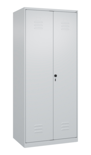 Die wichtigsten Details des C+P Putzmittelschrankes Classic Plus auf einen Blick:Über die Doppelflügeltür ist der Zugriff auf den Schrankinhalt besonders komfortabel. Die Lüftungsschlitze sorgen für eine erhöhte Belüftung und schützen somit den Inhalt des Schranks vor Feuchtigkeit und Schimmelbildung, da eine gute Luftzirkulation die Feuchtigkeit reduziert. Die innenliegenden Drehbolzen der einschlagenden Türen bieten den Vorteil einer sauberen Optik, da keine Schrauben oder Scharniere von außen sichtbar sind. Dadurch wird das Design des Schrankes nicht beeinträchtigt und das gesamte Möbelstück wirkt hochwertiger. Damit ist auch die glatte Oberfläche leichter zu reinigen, da keine Schmutz- oder Staubablagerungen an unzugänglichen Stellen zu befürchten sind. Jede Tür ist serienmäßig mit einer Anschlagsdämpfung ausgestattet, so dass, auch durch ein schwungvolles Schließen, die Tür nicht zuknallt. Das trägt nicht nur zu einer angenehmeren Geräuschkulisse bei, sondern schont auch den Stahlschrank vor Beschädigungen. 4 Ebene(n) mit Ablageboden. Die verkürzte Mitteltrennwand unterteilt den Schrank in zwei separate Bereiche, die auf verschiedene Arten und für unterschiedlich große Gegenstände genutzt werden können, lässt dabei im unteren Bereich jedoch Platz für Putzeimer oder andere Reinigungsgeräte. Links ausgestattet mit 4 Fächer mit festen Fachböden, rechts mit 1 stabile Garderobenstange aus Ovalprofil mit 4 verdrehsicheren Doppelschiebehaken. verschließbar mit Sicherheits-Drehriegel für Vorhängeschloss. Das Sicherheitsschloss ist besonders aufbruchsicher, da es im verschlossenen Zustand durchdreht und erst nach Entfernung des Schlosses einrastet. Türen gemeinsam verschließbar. Die zusätzlichen Lüftungsöffnungen im Abteil, kombiniert mit den Lüftungsschlitzen in der Tür, verbessern den Luftstrom. Dadurch wird der Schrankinhalt besser belüftet und trocknet schneller, ohne unangenehme Gerüche zu verursachen. Für eine besonders schlanke und raumsparende Optik steht der Schrank ohne Sockel oder Füße direkt auf dem Boden. Lediglich Bodenausgleichsschrauben sorgen für einen wackelfreien Stand bei eventuellen Bodenunebenheiten. Der Schrankboden ist für einen erhöhten Korrosionsschutz zusätzlich verzinkt. Korpus mit Einbrennlackierung in RAL7035 Lichtgrau. Front mit Einbrennlackierung in RAL7035 Lichtgrau.