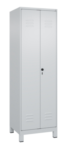 Die wichtigsten Details des C+P Putzmittelschrankes Classic Plus auf einen Blick:Über die Doppelflügeltür ist der Zugriff auf den Schrankinhalt besonders komfortabel. Die Lüftungsschlitze sorgen für eine erhöhte Belüftung und schützen somit den Inhalt des Schranks vor Feuchtigkeit und Schimmelbildung, da eine gute Luftzirkulation die Feuchtigkeit reduziert. Die innenliegenden Drehbolzen der einschlagenden Türen bieten den Vorteil einer sauberen Optik, da keine Schrauben oder Scharniere von außen sichtbar sind. Dadurch wird das Design des Schrankes nicht beeinträchtigt und das gesamte Möbelstück wirkt hochwertiger. Damit ist auch die glatte Oberfläche leichter zu reinigen, da keine Schmutz- oder Staubablagerungen an unzugänglichen Stellen zu befürchten sind. Jede Tür ist serienmäßig mit einer Anschlagsdämpfung ausgestattet, so dass, auch durch ein schwungvolles Schließen, die Tür nicht zuknallt. Das trägt nicht nur zu einer angenehmeren Geräuschkulisse bei, sondern schont auch den Stahlschrank vor Beschädigungen. 4 Ebene(n) mit Ablageboden. Die verkürzte Mitteltrennwand unterteilt den Schrank in zwei separate Bereiche, die auf verschiedene Arten und für unterschiedlich große Gegenstände genutzt werden können, lässt dabei im unteren Bereich jedoch Platz für Putzeimer oder andere Reinigungsgeräte. Links ausgestattet mit 4 Fächer mit festen Fachböden, rechts mit 1 stabile Garderobenstange aus Ovalprofil mit 4 verdrehsicheren Doppelschiebehaken. verschließbar mit Sicherheits-Drehriegel für Vorhängeschloss. Das Sicherheitsschloss ist besonders aufbruchsicher, da es im verschlossenen Zustand durchdreht und erst nach Entfernung des Schlosses einrastet. Türen gemeinsam verschließbar. Die zusätzlichen Lüftungsöffnungen im Abteil, kombiniert mit den Lüftungsschlitzen in der Tür, verbessern den Luftstrom. Dadurch wird der Schrankinhalt besser belüftet und trocknet schneller, ohne unangenehme Gerüche zu verursachen. Die untergebauten Füße aus Kunststoff verleihen dem Schrank nicht nur ein modernes und leichtes Erscheinungsbild und lassen ihn weniger massiv wirken, sondern bieten auch praktische Vorteile. Der offene Raum über dem Boden erleichtert die Reinigung und das Material Kunststoff bietet einen erhöhten Korrosionsschutz. Gerade in Umgebungen mit höheren Hygieneansprüchen ist dies ein wichtiger Aspekt. Korpus mit Einbrennlackierung in RAL7035 Lichtgrau. Front mit Einbrennlackierung in RAL7035 Lichtgrau.