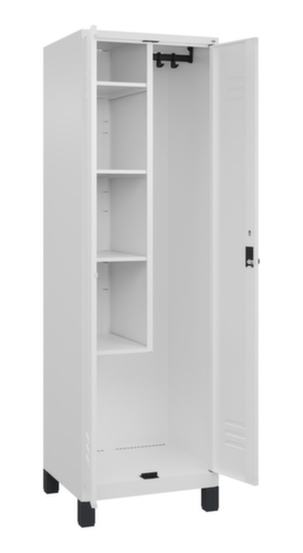 Die wichtigsten Details des C+P Putzmittelschrankes Classic Plus auf einen Blick:Über die Doppelflügeltür ist der Zugriff auf den Schrankinhalt besonders komfortabel. Die Lüftungsschlitze sorgen für eine erhöhte Belüftung und schützen somit den Inhalt des Schranks vor Feuchtigkeit und Schimmelbildung, da eine gute Luftzirkulation die Feuchtigkeit reduziert. Die innenliegenden Drehbolzen der einschlagenden Türen bieten den Vorteil einer sauberen Optik, da keine Schrauben oder Scharniere von außen sichtbar sind. Dadurch wird das Design des Schrankes nicht beeinträchtigt und das gesamte Möbelstück wirkt hochwertiger. Damit ist auch die glatte Oberfläche leichter zu reinigen, da keine Schmutz- oder Staubablagerungen an unzugänglichen Stellen zu befürchten sind. Jede Tür ist serienmäßig mit einer Anschlagsdämpfung ausgestattet, so dass, auch durch ein schwungvolles Schließen, die Tür nicht zuknallt. Das trägt nicht nur zu einer angenehmeren Geräuschkulisse bei, sondern schont auch den Stahlschrank vor Beschädigungen. 4 Ebene(n) mit Ablageboden. Die verkürzte Mitteltrennwand unterteilt den Schrank in zwei separate Bereiche, die auf verschiedene Arten und für unterschiedlich große Gegenstände genutzt werden können, lässt dabei im unteren Bereich jedoch Platz für Putzeimer oder andere Reinigungsgeräte. Links ausgestattet mit 4 Fächer mit festen Fachböden, rechts mit 1 stabile Garderobenstange aus Ovalprofil mit 4 verdrehsicheren Doppelschiebehaken. verschließbar mit Sicherheits-Drehriegel für Vorhängeschloss. Das Sicherheitsschloss ist besonders aufbruchsicher, da es im verschlossenen Zustand durchdreht und erst nach Entfernung des Schlosses einrastet. Türen gemeinsam verschließbar. Die zusätzlichen Lüftungsöffnungen im Abteil, kombiniert mit den Lüftungsschlitzen in der Tür, verbessern den Luftstrom. Dadurch wird der Schrankinhalt besser belüftet und trocknet schneller, ohne unangenehme Gerüche zu verursachen. Die untergebauten Füße aus Kunststoff verleihen dem Schrank nicht nur ein modernes und leichtes Erscheinungsbild und lassen ihn weniger massiv wirken, sondern bieten auch praktische Vorteile. Der offene Raum über dem Boden erleichtert die Reinigung und das Material Kunststoff bietet einen erhöhten Korrosionsschutz. Gerade in Umgebungen mit höheren Hygieneansprüchen ist dies ein wichtiger Aspekt. Korpus mit Einbrennlackierung in RAL9016 Verkehrsweiß. Front mit Einbrennlackierung in RAL9016 Verkehrsweiß.
