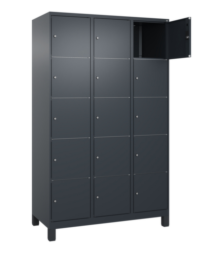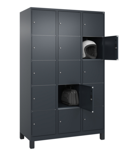 Die wichtigsten Maße des C+P Schließfachschrankes Classic Plus auf einen Blick:Korpus mit einfacher Flügeltür. Die innenliegenden Drehbolzen der einschlagenden Türen bieten den Vorteil einer sauberen Optik, da keine Schrauben oder Scharniere von außen sichtbar sind. Dadurch wird das Design des Schrankes nicht beeinträchtigt und das gesamte Möbelstück wirkt hochwertiger. Damit ist auch die glatte Oberfläche leichter zu reinigen, da keine Schmutz- oder Staubablagerungen an unzugänglichen Stellen zu befürchten sind. Jede Tür ist serienmäßig mit einer Anschlagsdämpfung ausgestattet, so dass, auch durch ein schwungvolles Schließen, die Tür nicht zuknallt. Das trägt nicht nur zu einer angenehmeren Geräuschkulisse bei, sondern schont auch den Stahlschrank vor Beschädigungen. Von der Natur inspiriert schafft der BIONIC Steel Frame eine besonders effiziente und stabile Konstruktion. Durch eine raffinierte innere Struktur aus Faltungen, Streben und Zwischenräumen, sowie höhere Materialstärke an entscheidenden Stellen, wie z. B. im vorderen Bereich der Seitenwände und in den Trennwand- und Kastenprofilen, wird die Verwindungssteifigkeit zusätzlich erhöht. Verschließbar mit Zylinderschloss. Die untergebauten Füße aus Kunststoff verleihen dem Schrank nicht nur ein modernes und leichtes Erscheinungsbild und lassen ihn weniger massiv wirken, sondern bieten auch praktische Vorteile. Der offene Raum über dem Boden erleichtert die Reinigung und das Material Kunststoff bietet einen erhöhten Korrosionsschutz. Gerade in Umgebungen mit höheren Hygieneansprüchen ist dies ein wichtiger Aspekt. Konstruktion aus Stahl, stabil verschweißt. Das macht die Konstruktion besonders robust und widerstandsfähig und somit langlebiger. Die verschweißten Ecken und Kanten des Korpus gewährleisten eine höhere Dichtigkeit und somit eine bessere Schutzfunktion gegen Staub, Feuchtigkeit und Schmutz als eine geschraubte Konstruktion. Zudem sind keine regelmäßigen Wartungsarbeiten und Nachjustierungen nötig. Korpus mit Einbrennlackierung in RAL7016 Anthrazitgrau. Front mit Einbrennlackierung in RAL7016 Anthrazitgrau.