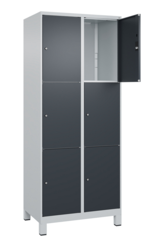Die wichtigsten Maße des C+P Schließfachschrankes Classic Plus auf einen Blick:Korpus mit einfacher Flügeltür. Die innenliegenden Drehbolzen der einschlagenden Türen bieten den Vorteil einer sauberen Optik, da keine Schrauben oder Scharniere von außen sichtbar sind. Dadurch wird das Design des Schrankes nicht beeinträchtigt und das gesamte Möbelstück wirkt hochwertiger. Damit ist auch die glatte Oberfläche leichter zu reinigen, da keine Schmutz- oder Staubablagerungen an unzugänglichen Stellen zu befürchten sind. Jede Tür ist serienmäßig mit einer Anschlagsdämpfung ausgestattet, so dass, auch durch ein schwungvolles Schließen, die Tür nicht zuknallt. Das trägt nicht nur zu einer angenehmeren Geräuschkulisse bei, sondern schont auch den Stahlschrank vor Beschädigungen. Von der Natur inspiriert schafft der BIONIC Steel Frame eine besonders effiziente und stabile Konstruktion. Durch eine raffinierte innere Struktur aus Faltungen, Streben und Zwischenräumen, sowie höhere Materialstärke an entscheidenden Stellen, wie z. B. im vorderen Bereich der Seitenwände und in den Trennwand- und Kastenprofilen, wird die Verwindungssteifigkeit zusätzlich erhöht. Verschließbar mit Zylinderschloss. Die untergebauten Füße aus Kunststoff verleihen dem Schrank nicht nur ein modernes und leichtes Erscheinungsbild und lassen ihn weniger massiv wirken, sondern bieten auch praktische Vorteile. Der offene Raum über dem Boden erleichtert die Reinigung und das Material Kunststoff bietet einen erhöhten Korrosionsschutz. Gerade in Umgebungen mit höheren Hygieneansprüchen ist dies ein wichtiger Aspekt. Konstruktion aus Stahl, stabil verschweißt. Das macht die Konstruktion besonders robust und widerstandsfähig und somit langlebiger. Die verschweißten Ecken und Kanten des Korpus gewährleisten eine höhere Dichtigkeit und somit eine bessere Schutzfunktion gegen Staub, Feuchtigkeit und Schmutz als eine geschraubte Konstruktion. Zudem sind keine regelmäßigen Wartungsarbeiten und Nachjustierungen nötig. Korpus mit Einbrennlackierung in RAL7035 Lichtgrau. Front mit Einbrennlackierung in RAL7016 Anthrazitgrau.