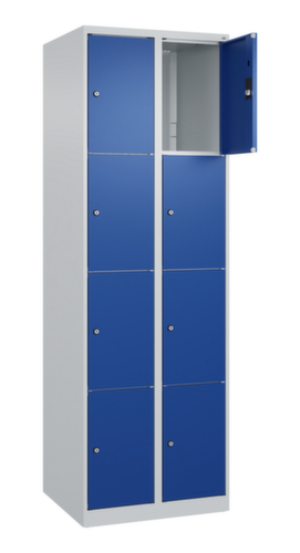 Die wichtigsten Maße des C+P Schließfachschrankes Classic Plus auf einen Blick:Korpus mit einfacher Flügeltür. Die innenliegenden Drehbolzen der einschlagenden Türen bieten den Vorteil einer sauberen Optik, da keine Schrauben oder Scharniere von außen sichtbar sind. Dadurch wird das Design des Schrankes nicht beeinträchtigt und das gesamte Möbelstück wirkt hochwertiger. Damit ist auch die glatte Oberfläche leichter zu reinigen, da keine Schmutz- oder Staubablagerungen an unzugänglichen Stellen zu befürchten sind. Jede Tür ist serienmäßig mit einer Anschlagsdämpfung ausgestattet, so dass, auch durch ein schwungvolles Schließen, die Tür nicht zuknallt. Das trägt nicht nur zu einer angenehmeren Geräuschkulisse bei, sondern schont auch den Stahlschrank vor Beschädigungen. Von der Natur inspiriert schafft der BIONIC Steel Frame eine besonders effiziente und stabile Konstruktion. Durch eine raffinierte innere Struktur aus Faltungen, Streben und Zwischenräumen, sowie höhere Materialstärke an entscheidenden Stellen, wie z. B. im vorderen Bereich der Seitenwände und in den Trennwand- und Kastenprofilen, wird die Verwindungssteifigkeit zusätzlich erhöht. Verschließbar mit Zylinderschloss. Für eine besonders schlanke und raumsparende Optik steht der Schrank ohne Sockel oder Füße direkt auf dem Boden. Lediglich Bodenausgleichsschrauben sorgen für einen wackelfreien Stand bei eventuellen Bodenunebenheiten. Der Schrankboden ist für einen erhöhten Korrosionsschutz zusätzlich verzinkt. Konstruktion aus Stahl, stabil verschweißt. Das macht die Konstruktion besonders robust und widerstandsfähig und somit langlebiger. Die verschweißten Ecken und Kanten des Korpus gewährleisten eine höhere Dichtigkeit und somit eine bessere Schutzfunktion gegen Staub, Feuchtigkeit und Schmutz als eine geschraubte Konstruktion. Zudem sind keine regelmäßigen Wartungsarbeiten und Nachjustierungen nötig. Korpus mit Einbrennlackierung in RAL7035 Lichtgrau. Front mit Einbrennlackierung in RAL5010 Enzianblau.